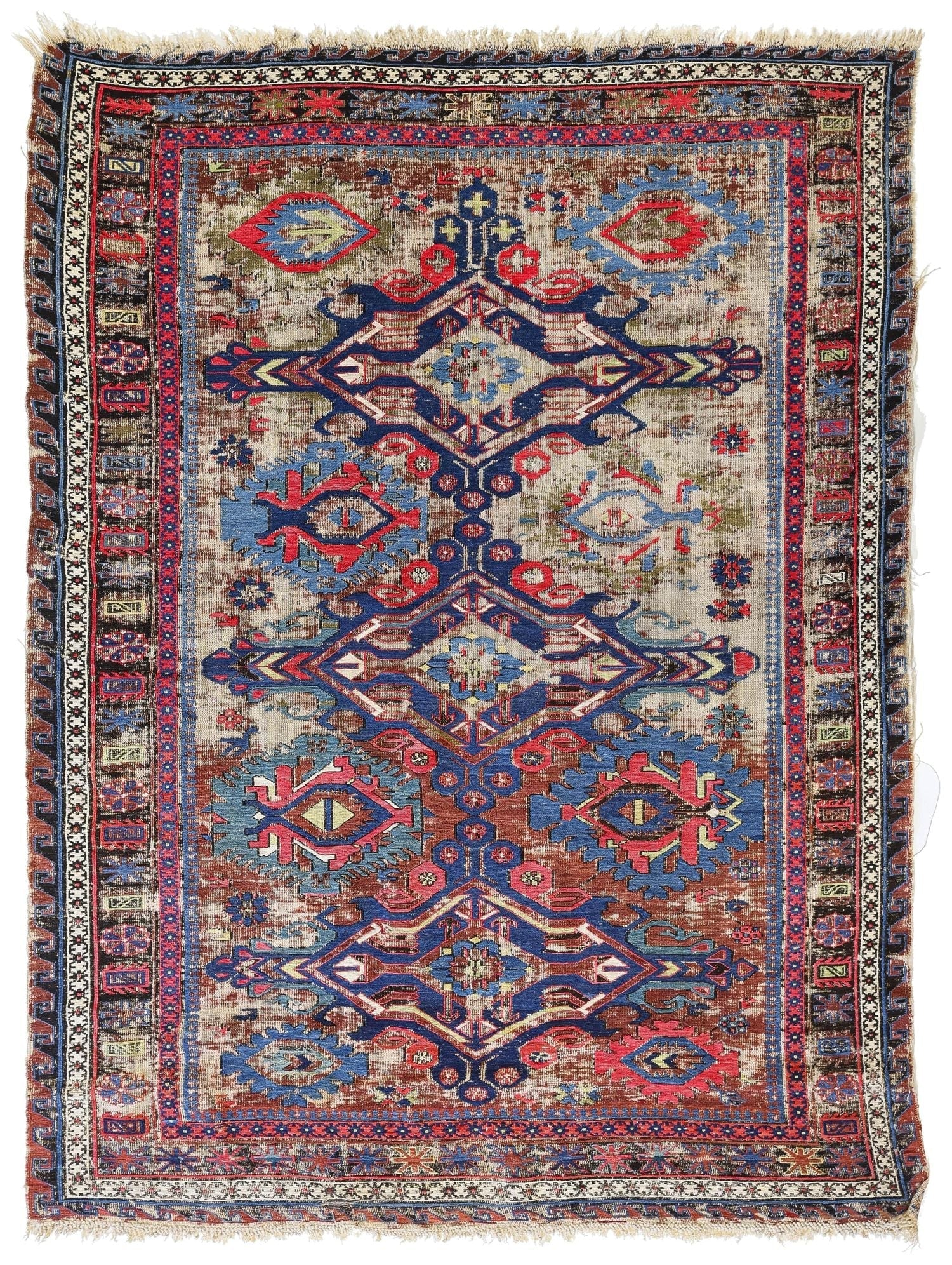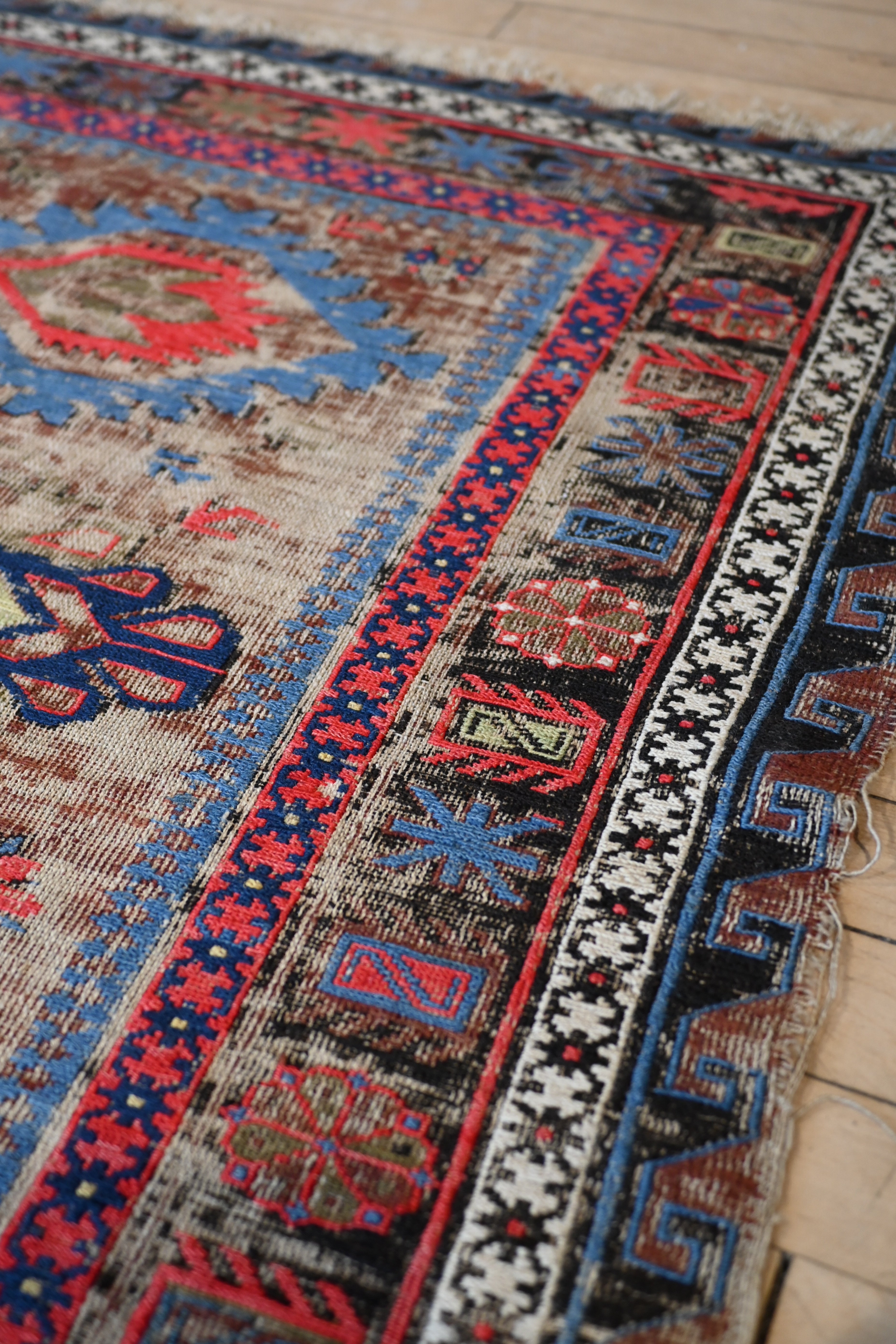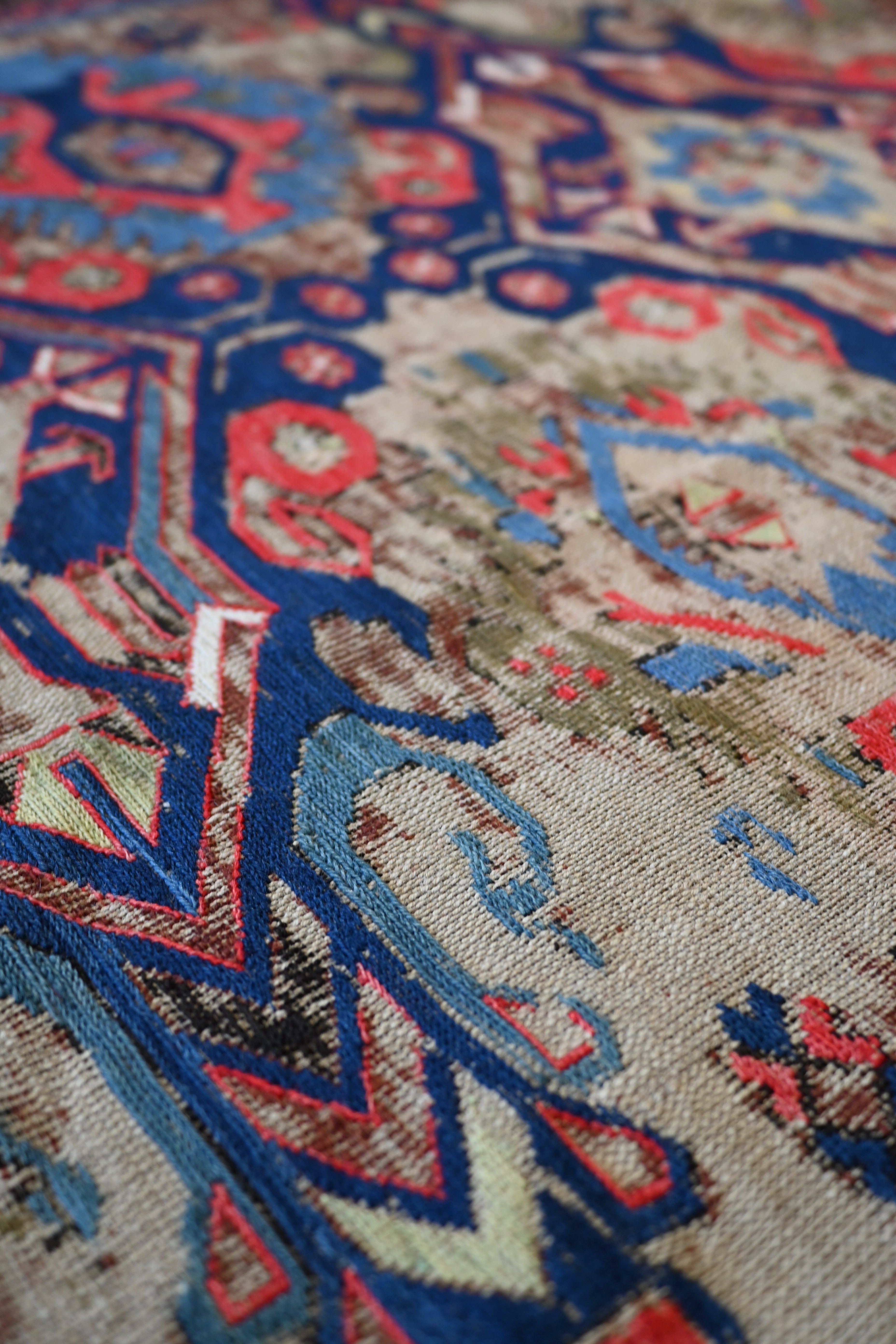 a beautifully distressed Soumac with deep blue, sage green, violet, cherry, sage green and ivory