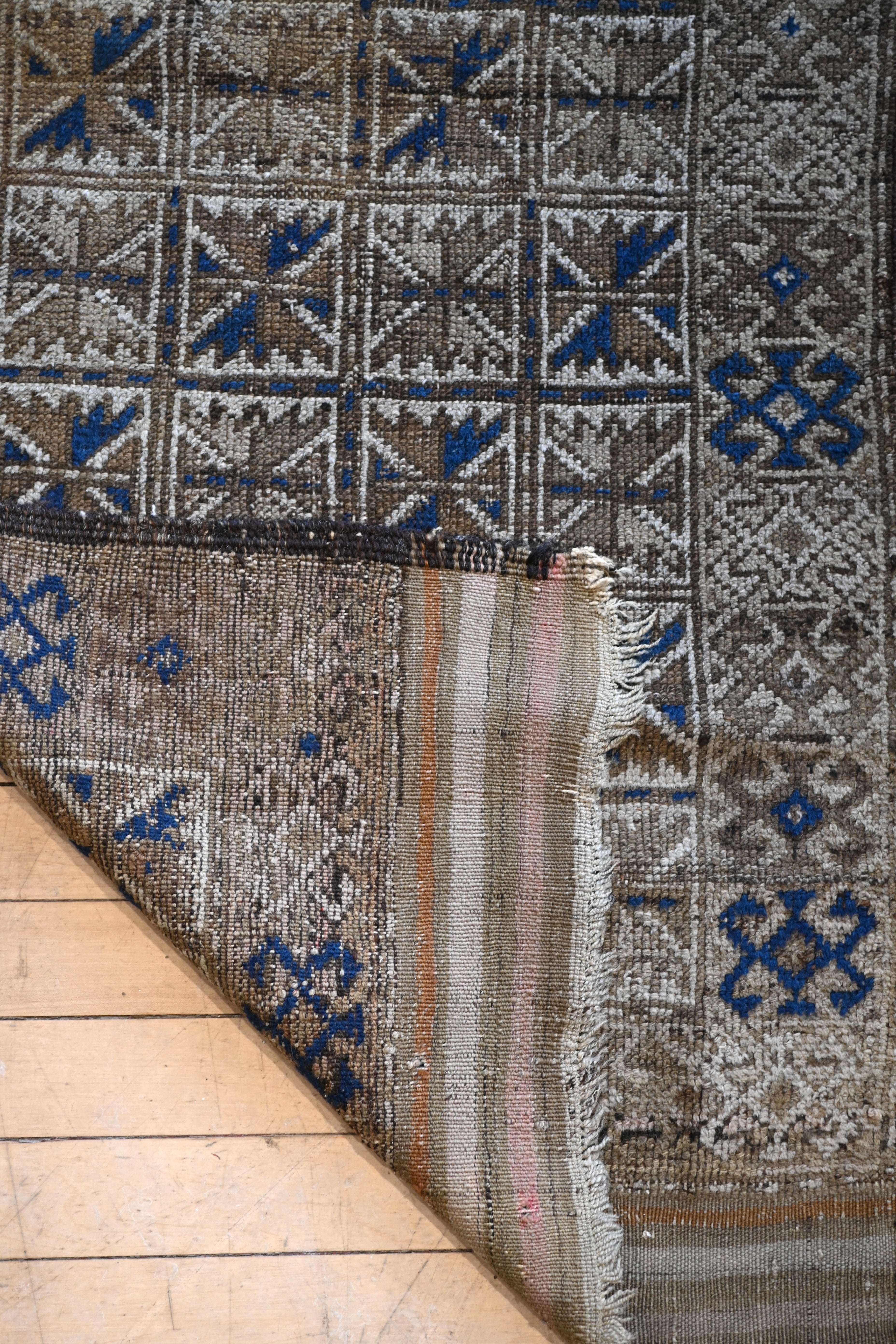 Antique tribal rug with neutral browns and blue accents with striped kilim ends