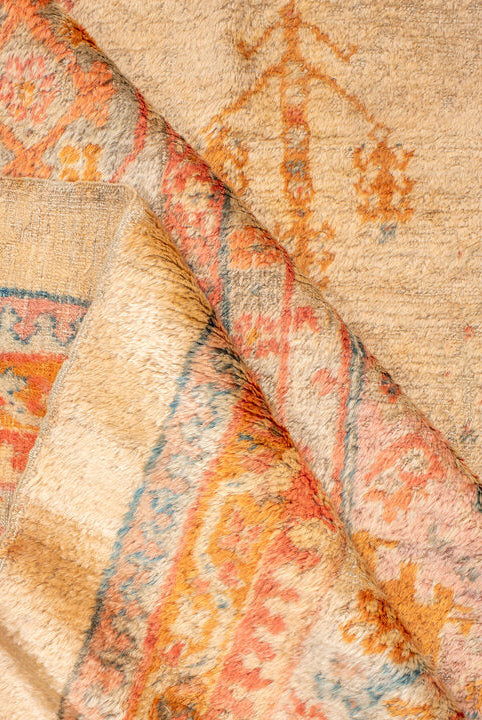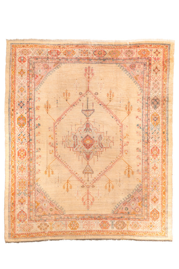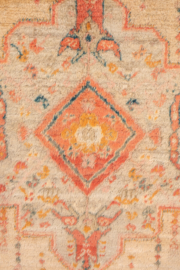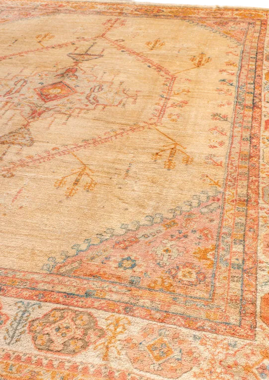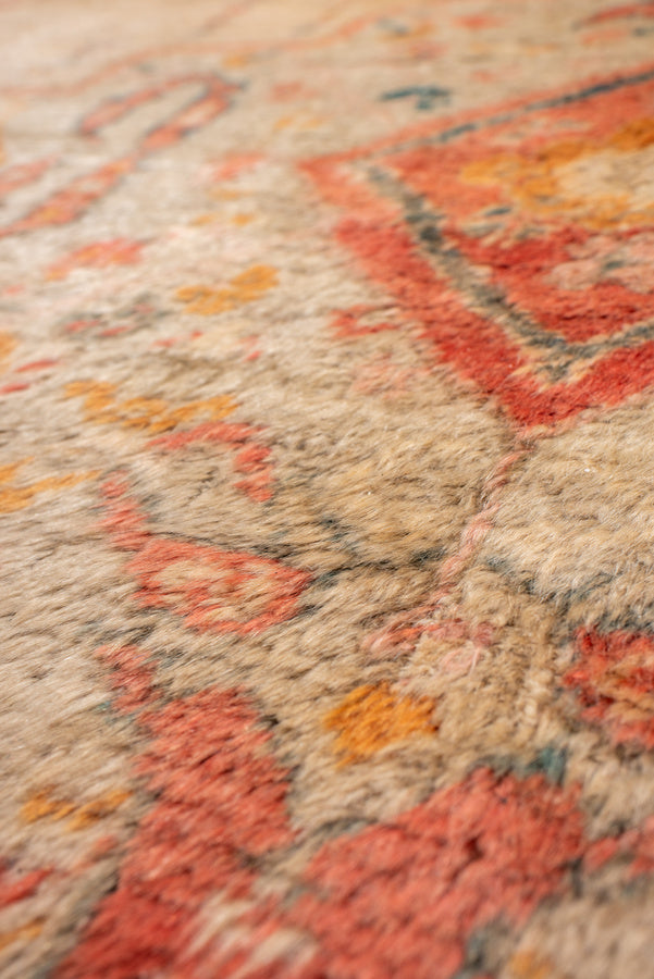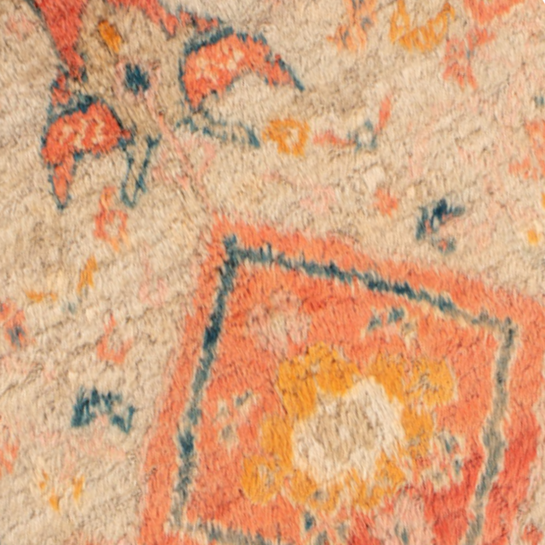 a fine, turn of the century Oushak made of angora wool. shades of soft apricot, teal, bright clementine, ochre, blush, denim blue and camel