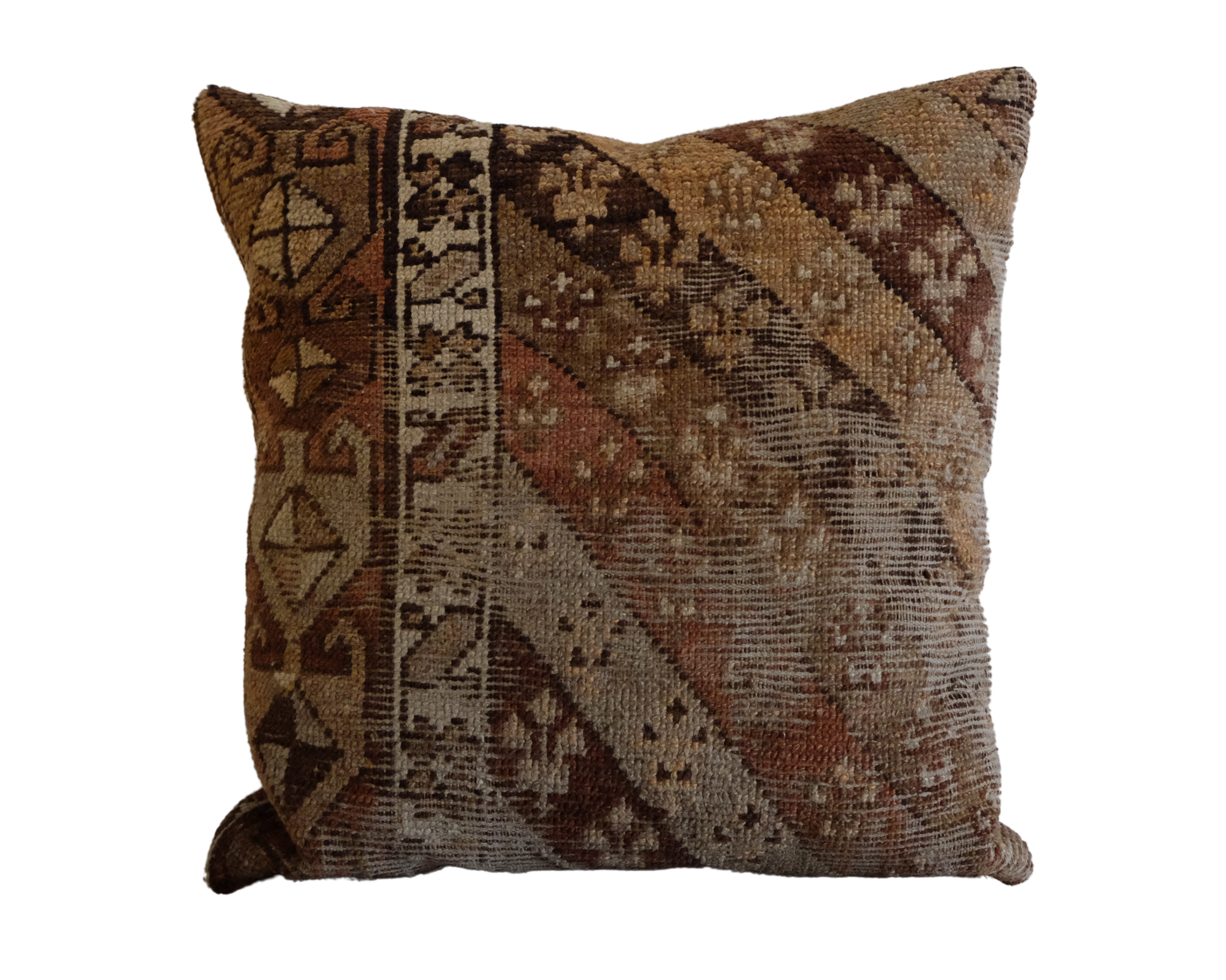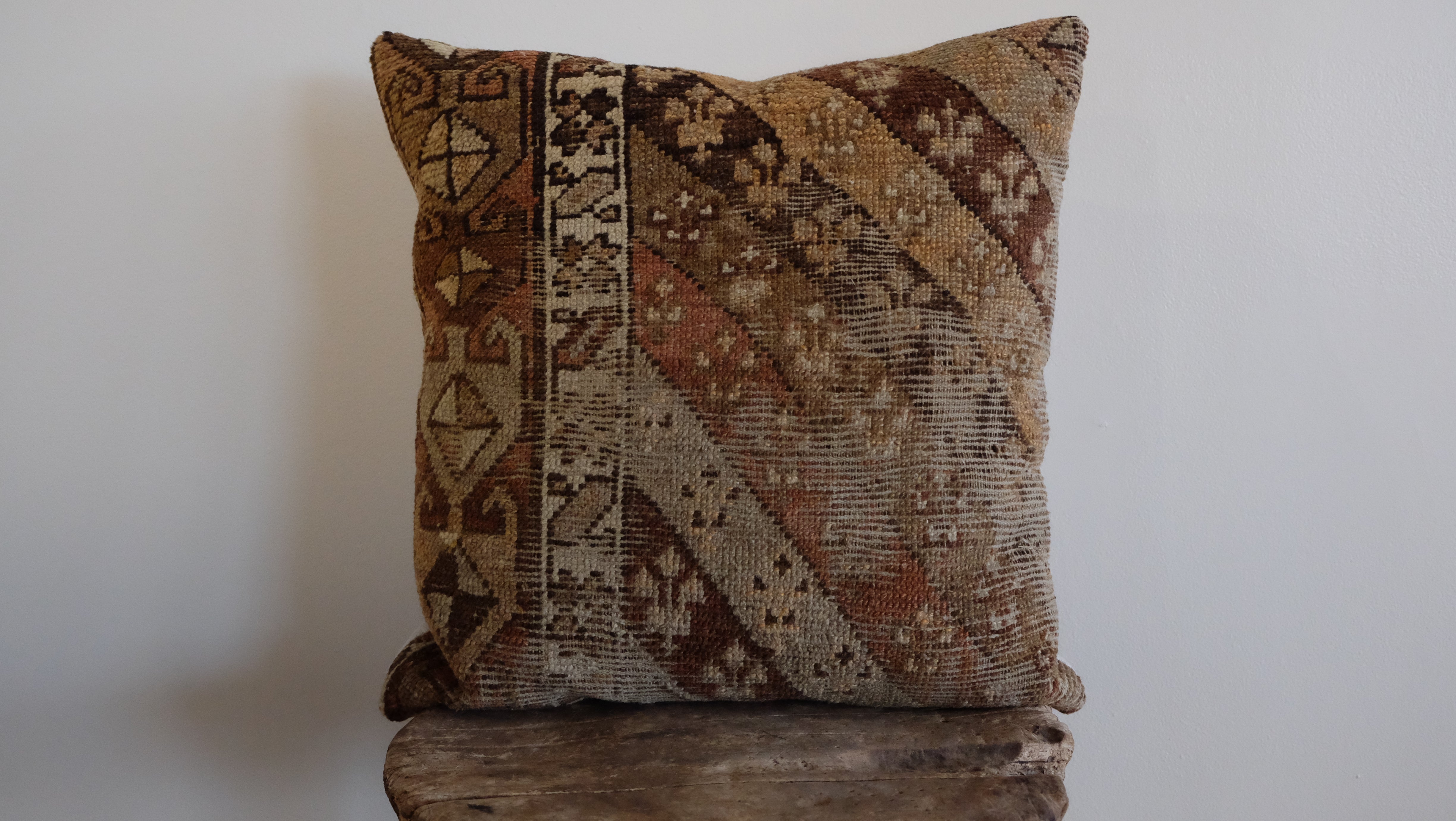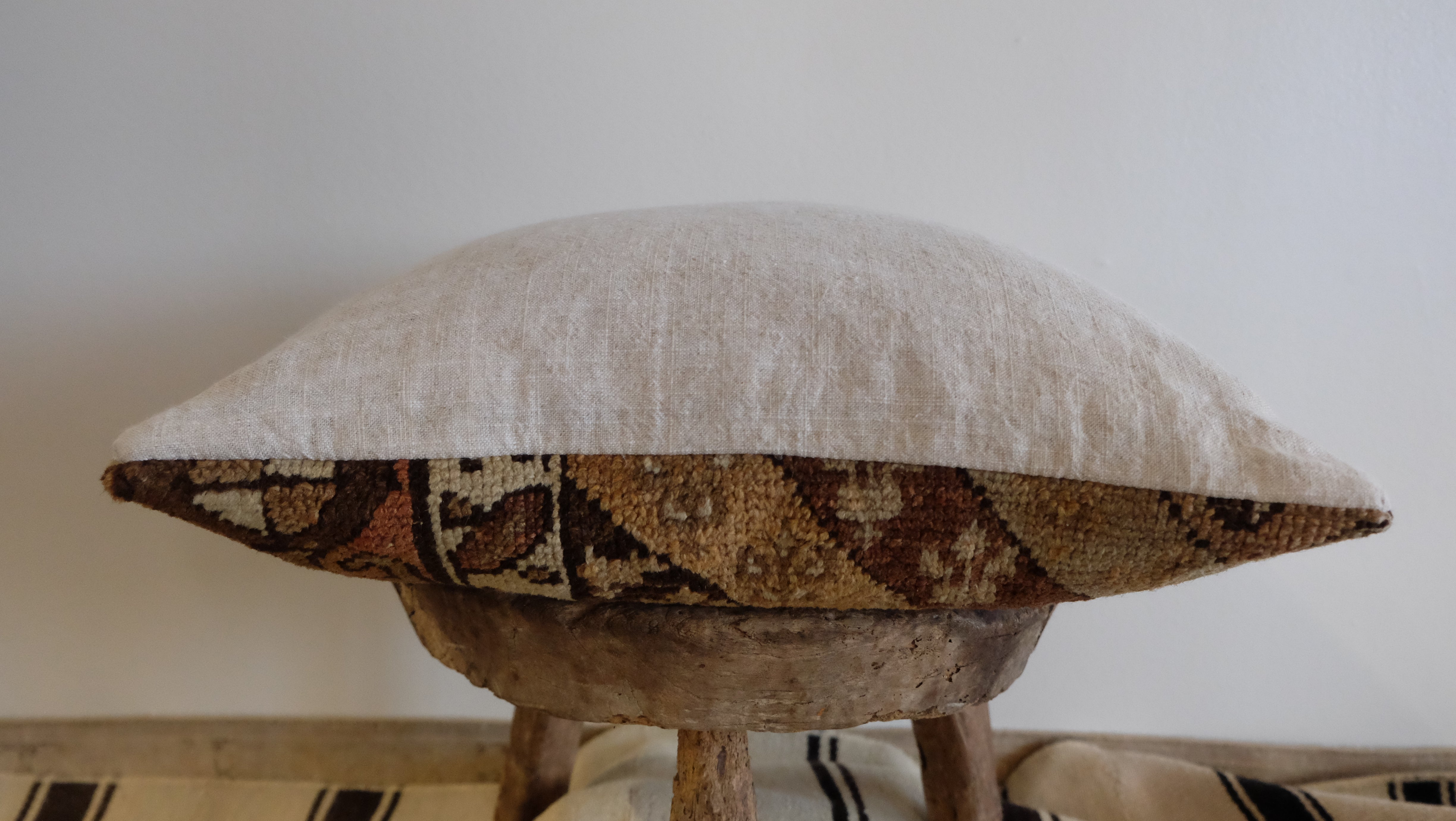A neutral caucasian rug pillow with a flax linen backing. Down and feather insert included