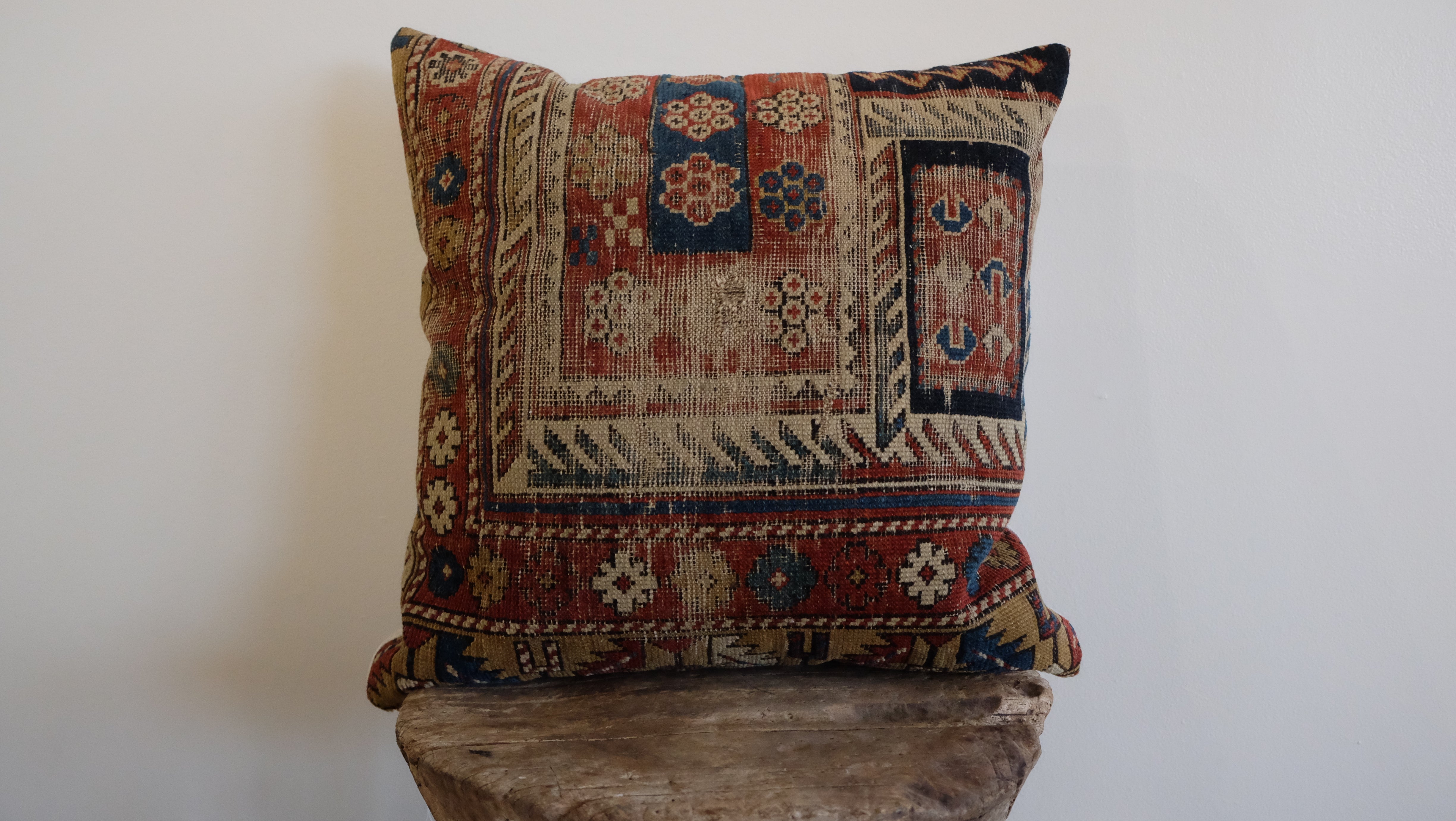 Antique Shirvan rug pillow, fully lined with hidden zipper enclosure