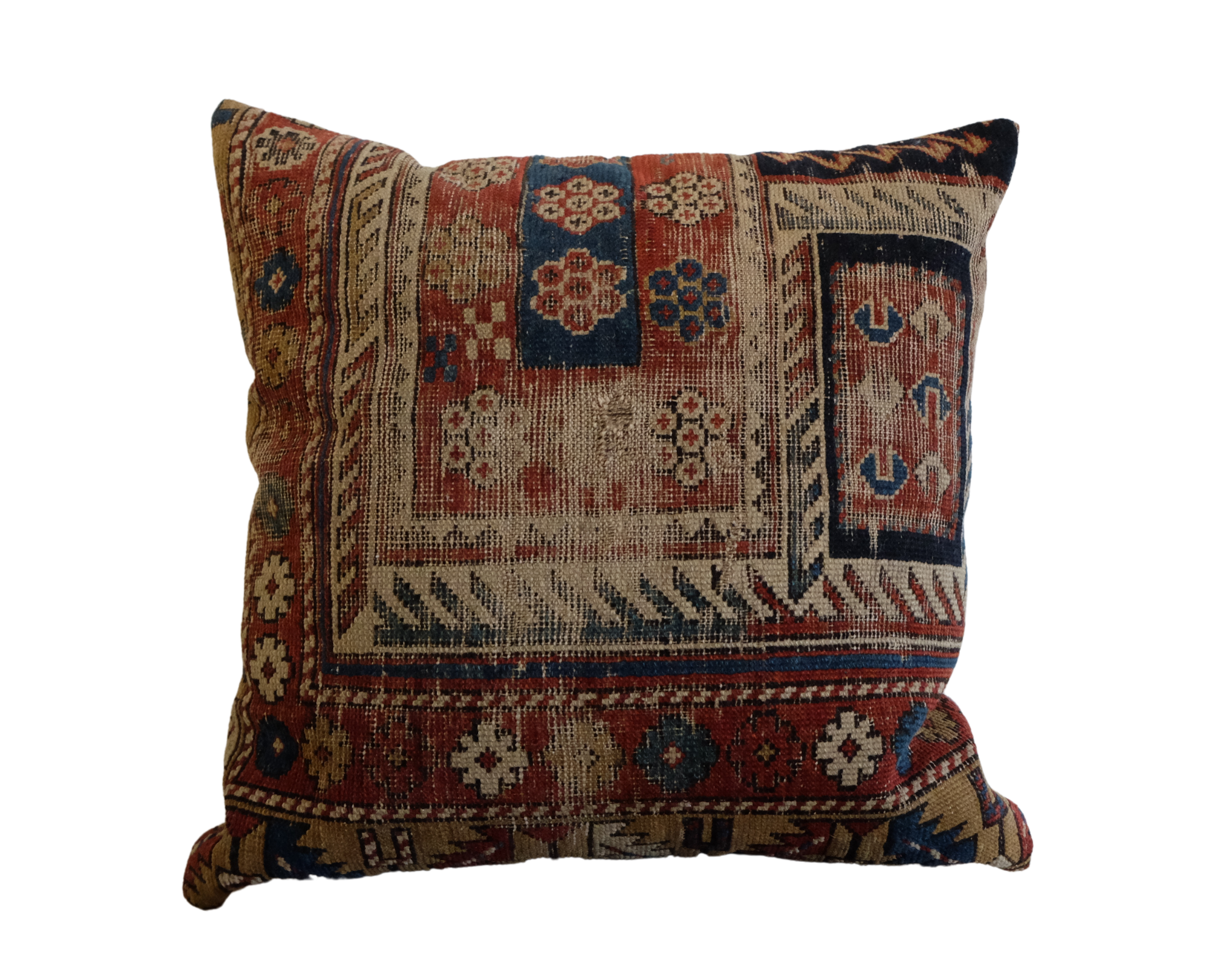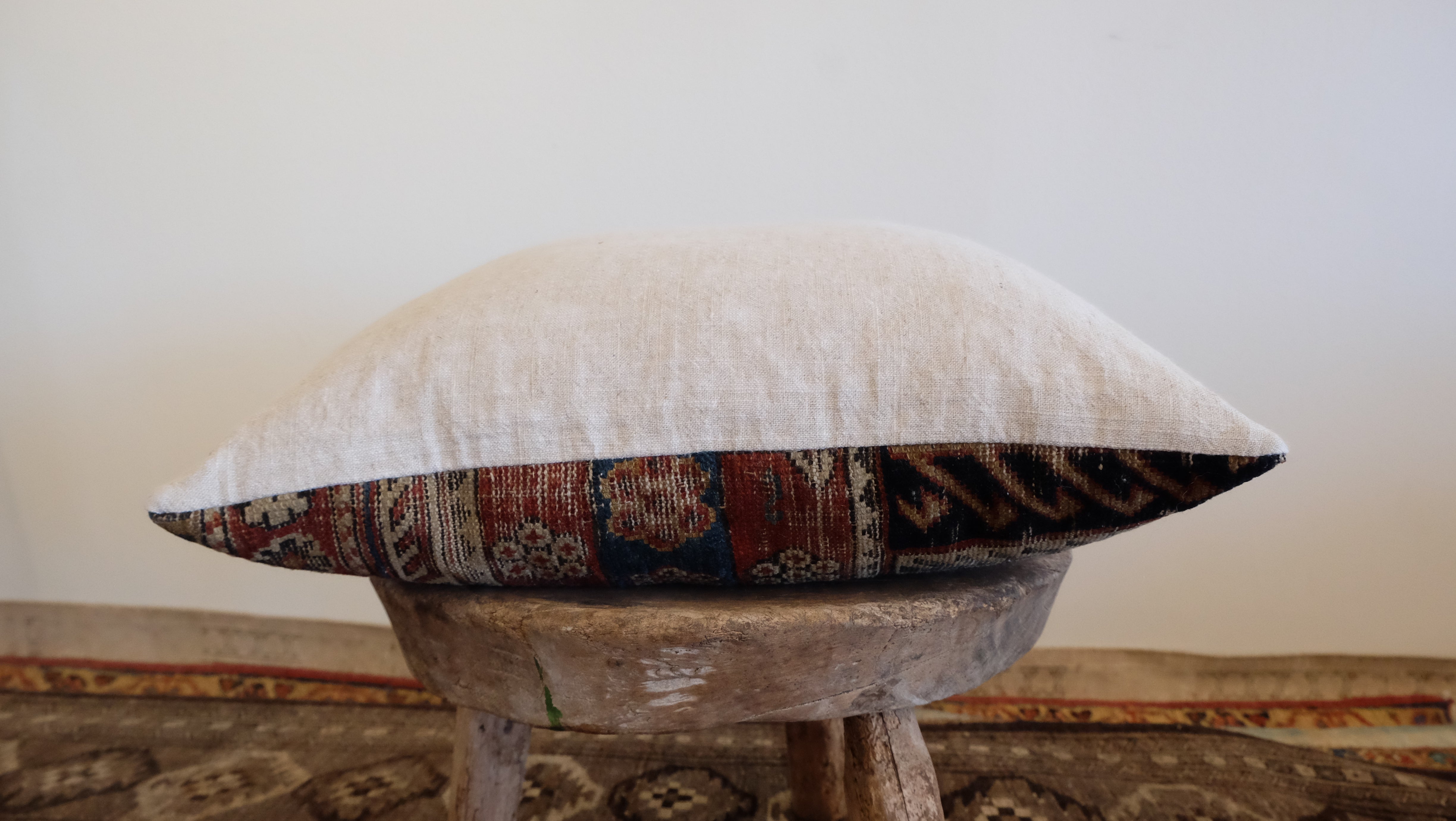 Antique caucasian rug pillow with a flax linen backing. Down and feather insert included