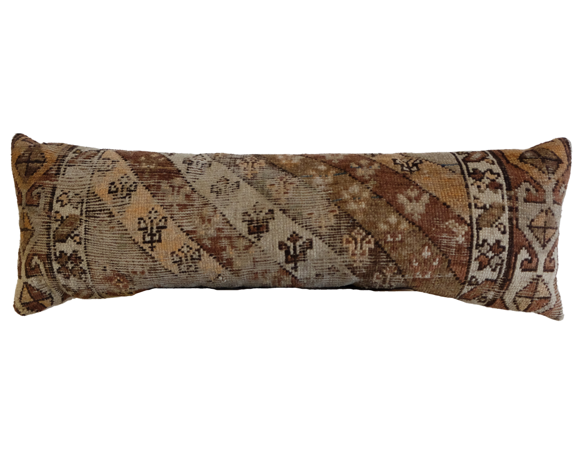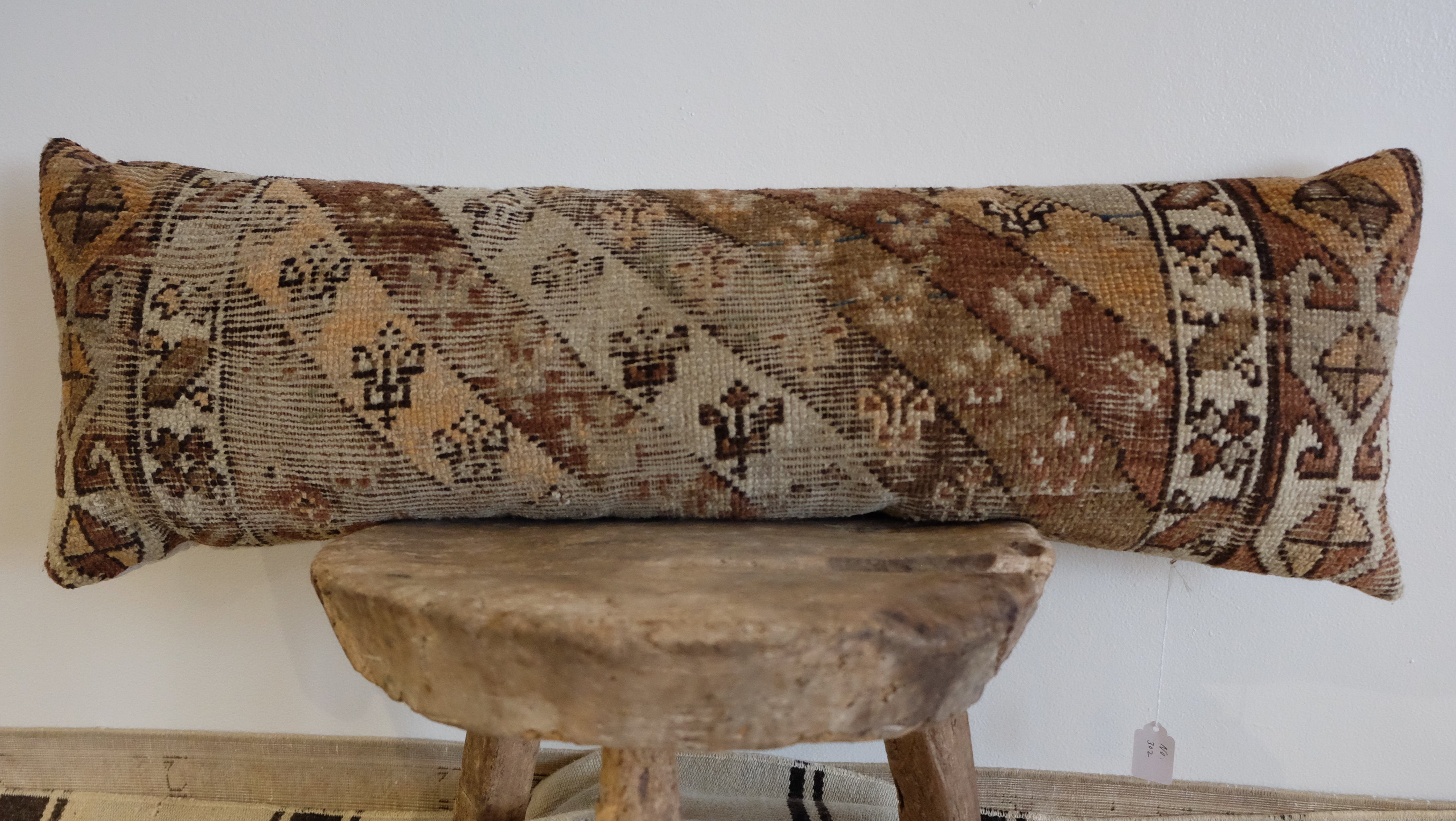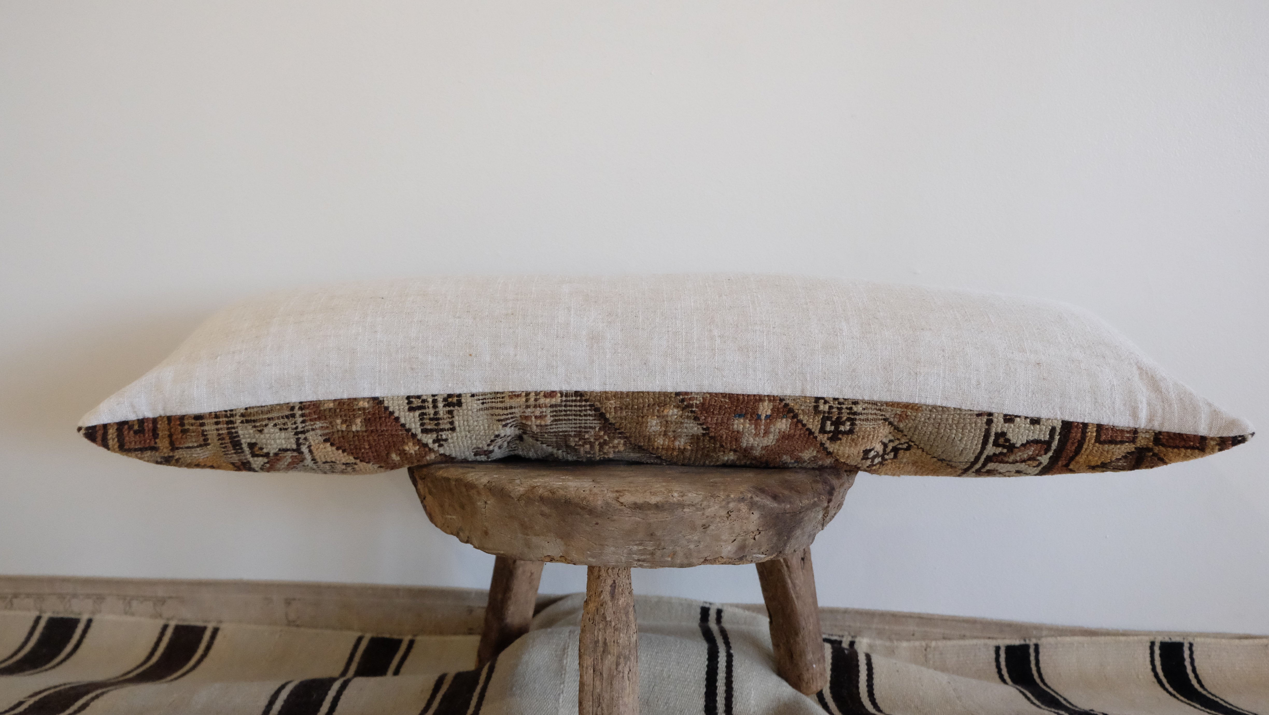 A neutral caucasian rug pillow with a flax linen backing. Down and feather insert included